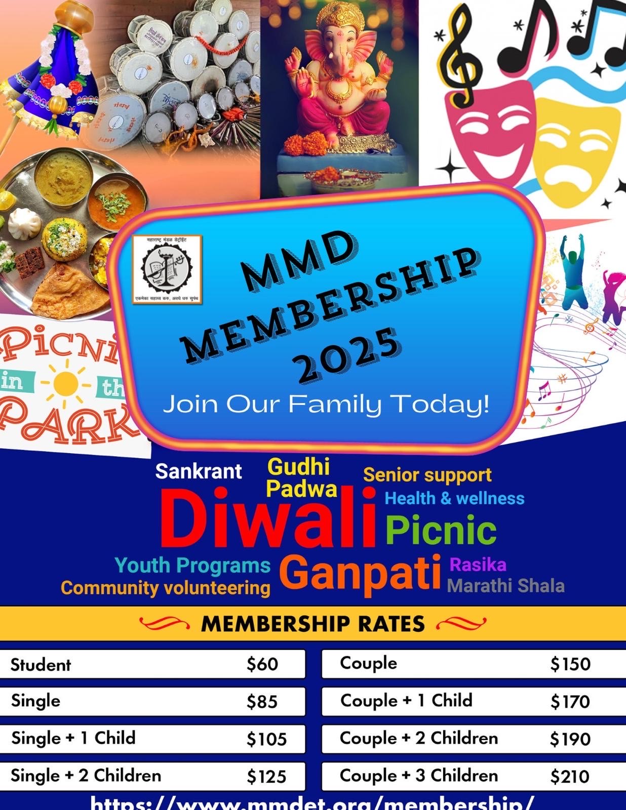 - Membership includes six MMD core programs (Sankrant, Gudhi Padwa, Picnic, Ganesh Utsav, Kojagiri, and Diwali).